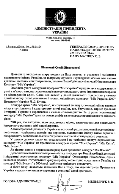 - Конечно! Виктор Владимирович высказал в нем много приятных и лестных слов в адрес Национального комитета и мой лично. А в конце стояла интересная фраза: "Разрешите выразить уверенность, что при вашей всесторонней помощи и поддержке победительница конкурса "Мисс Украина" Александра Николаенко, одна из наиболее известных и титулованных красавиц страны, сможет достойно представить Украину на конкурсе "Мисс Вселенная" в 2004 году и добиться успешного результата".