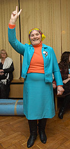 Затем на сцену вышла главная народная вдохновительница "оранжевой революции" баба Параска. 67-летняя Прасковья Васильевна Королюк отстояла на Майдане от первого до последнего дня. Одетая в бирюзовый костюм и оранжевый гольф, она была сплошь увешана значками "Ющенко" и "Тимошенко" и наградами от Президента за особый вклад в революционное дело. Несмотря на бальзаковский возраст, Прасковья Васильевна вела себя крайне активно: беспрестанно прыгала, поднимая руки вверх, пела: "Разом нас багато, нас не подолати!" и кричала: "Ющенко, так!" даже без микрофона. Со сцены ее с трудом удалось увести. "Наташка, забери ее", - попросил Малахов стоявшую за кулисами Королеву.
