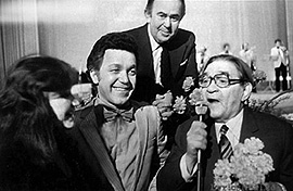 | Алла Пугачева, Иосиф Кобзон и конферансье Борис Брунов слушают Леонида Осиповича |
