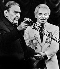 Кстати, церемония награждения проходила все в том же саду «Эрмитаж». Помню, обращаясь к группе своих приближенных, Леонид Осипович сказал об официальных лицах, которые приехали его поздравлять: «Не знаю, кто их сюда пригнал, - все они говорят о том, как сильно меня любят, а я их первый раз в жизни вижу». После награждения состоялся роскошный банкет, на который был приглашен и ваш покорный слуга. «Ленечка, - сказал мне виновник торжества, - мы на вас рассчитываем».
