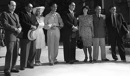 | Члены советской делегации Сергей Герасимов, Александр Птушко, Марина Ладынина, Сергей Юткевич, Михаил Калатозов, Галина Водяницкая, Фридрих Эрмлер и Борис Чирков на Первом Международном кинофестивале в Каннах, 1946 год |