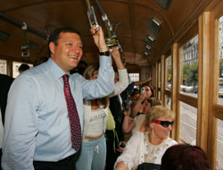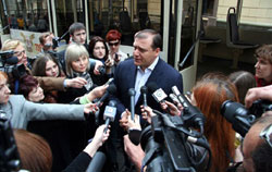 ![]() Выйдя из троллейбуса, Михаил Маркович сразу стал отвечать на многочисленные вопросы Фото PHL |