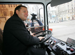 ![]() Михаил Добкин за рулем харьковского троллейбуса нового образца |