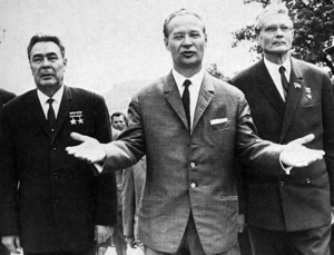 | Генеральный секретарь ЦК КПСС Леонид Брежнев и главный советский идеолог, член Политбюро ЦК КПСС Михаил Суслов с первым секретарем Компартии Чехословакии, инициатором реформ, известных как «Пражская весна», Александром Дубчеком (в центре). После подавления «Пражской весны» Дубчек формально пребывал на посту первого секретаря ЦК КПЧ до апрельского пленума в 1969 году, когда его отстранили от власти, заменив Густавом Гусаком — полностью лояльным к СССР |