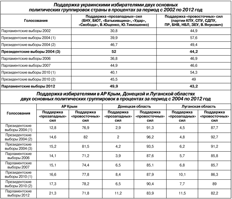 Два случая победы «прозападных» («проукраинских») сил (из девяти) показывают, насколько они не могли гарантировать устойчивого успеха. Первый раз это произошло в результате второго дополнительного (третьего) тура президентских выборов 2004 года благодаря беспрецедентной мобилизации гражданского общества в ходе «оранжевой революции» и балансирования страны на грани жесткого гражданского противостояния. Второй раз это случилось в ходе парламентских выборов 2012 года, когда электоральную победу не удалось конвертировать в приобретение власти из-за изменения Януковичем Конституции и превращения политической системы страны из парламентско-президентской в президентскую.