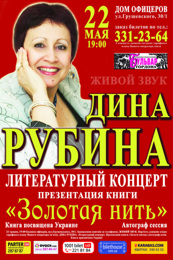 Приглашаем всех на творческий вечер Дины Рубиной 22 мая в 19:00, в Доме офицеров, получить заряд положительных эмоций и интеллектуальных знаний!