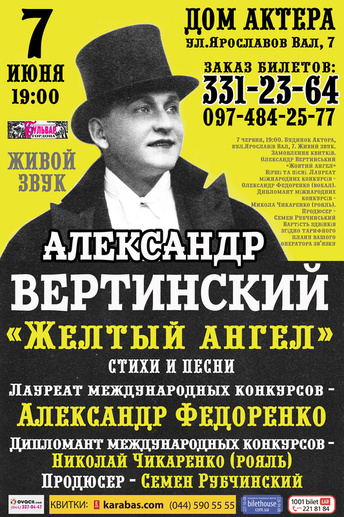 Представляемая программа «Желтый Ангел» на стихи и романсы А. Н. Вертинского в исполнении Лауреата Международного конкурса - Александра Федоренко. Польская пресса наградила его титулом «Принц Настроения». Федоренко гастролирует во многих городах Украины, Кракове, Варшаве, Иерусалиме, Праге. Эмоциональный накал, прорываясь сквозь пелену утонченной иронии, создает особую ауру, особый стиль.