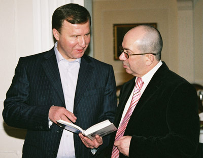 ![]() Бывший подводник, а ныне начальник Киевской региональной таможни Анатолий Макаренко показывает главному редактору "ФАКТОВ" Александру Швецу книгу стихов Александра Розенбаума "Белая птица удачи". В ней опубликовано фото, сделанное во время выступления маэстро перед подводниками |