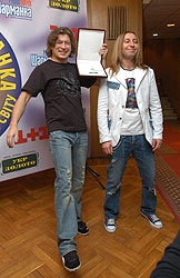 ![]() Шура и Лева из "Би-2" не скрывали радости от полученной награды |