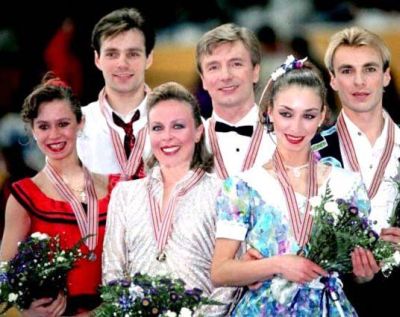 ![]() 1994 год, Копенгаген. Чемпионат Европы. Золото — британская пара Джейн Торвилл и Кристофер Дин. Серебро — Оксана Грищук и Евгений Платов, бронза — Майя Усова и Александр Жулин |
