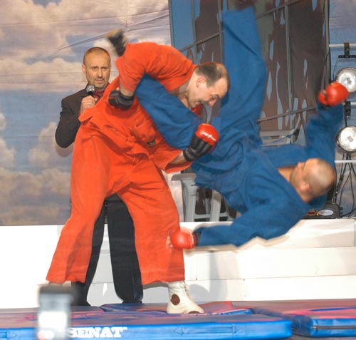 ![]() Сюрприз от Виктора Вдовкина: показательное выступление его воспитанников - чемпионов мира 2005 года по универсальному бою заслуженных мастеров спорта Валерия Бондаря и Павла Горлатова |