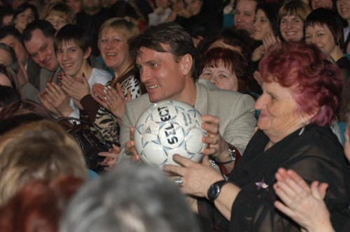 ![]() Запущенный прямо со сцены мяч от Олега Блохина поймал счастливый зритель Андрей Савицкий |