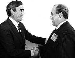 | Ведущий американской телекомпании CBS Дэн Разер поздравляет Виталия Коротича с получением награды «Лучший международный редактор года», ООН, 1988 год |