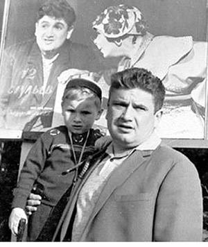 | Евгений Яковлевич с сыном Женей у Театра сатиры, 1963 год (всего у артиста трое детей: два сына и дочь) |
