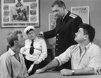 | Олег Борисов, Евгений Моргунов, Анатолий Папанов и Евгений Весник (председатель колхоза), «Стежки-дорожки», 1963 год. Фото Fotobank.ua |