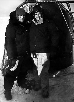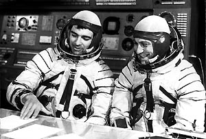 ![]() Космонавты Зудов и Рождественский (слева) сразу после спасения |