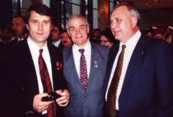 ![]() Виктор Ющенко, Анатолий Мокренко и Виталий Карпенко на Всемирном форуме украинцев в Киеве, 1999 год |