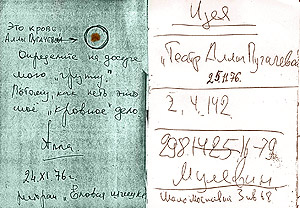 - Да, совершенно верно, а потом, мы с ней условились, что поедем в ресторан «Сосновый бор» (она называла его «Еловая шишка») на Рублевке. Там за столом Алла разрезала себе ножом палец, открыла первую страницу моей записной книжки, выдавила кровь и ею написала: «Это кровь Аллы Пугачевой. Определите на досуге мою группу, потому как петь - мое кровное дело».