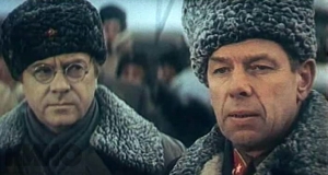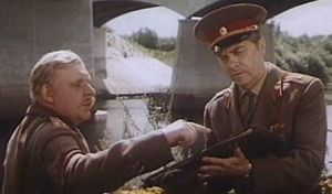 | Анатолий Кузнецов (дивизионный комиссар Веснин) и Георгий Жженов (командующий армией Бессонов) в фильме по одноименному роману Юрия Бондарева «Горячий снег», 1972 год |