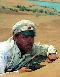 ...Хочу вам по поводу «Белого солнца пустыни» мысль одну высказать... Это мое твердое убеждение, которое я настойчиво и режиссеру пытался внушить, и товарищам, хотя они, может, в этом и не нуждались — все-таки и Спартак Мишулин, и тем более Луспекаев достаточно опытными были людьми. «Нам, — говорил, — с американскими вестернами в умении скакать на лошади и пистолетами крутить соревноваться не надо — вряд ли тут с ними тягаться можем. Они уже на этом собаку, как говорится, съели, не один десяток лет тренируются — давайте проявление человеческих характеров в поступках героев искать, а стрелять — это в последний момент, в последний!». В результате, кого из персонажей ни возьмите: и Саида, и таможенника Верещагина, и красноармейца Сухова, — за каждым из них целая история, поэтому мой друг Вася Ливанов (Шерлок Холмс всемирно признанный) мне внушал: «Толя, ты не играл роль, а родил ее, создал — понял?». Я согласно кивал: «Понял, Вася» — в этом направлении мы и работали.
