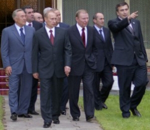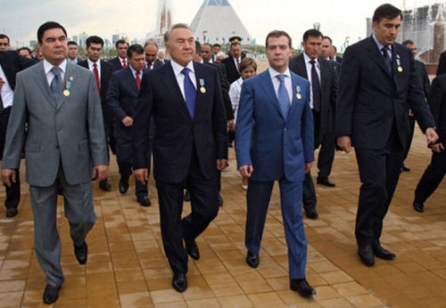 | Президент Туркмении Гурбангулы Бердымухамедов, президент Казахстана Нурсултан Назарбаев, президент России Дмитрий Медведев и Михаил Саакашвили во время прогулки по Астане, июль 2008 года. «Медведев, наверное, нормальным бы стал человеком, если бы в плохую компанию не попал, но, кстати, о войне меня предупредил» |