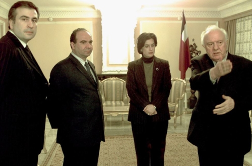 | Михаил Саакашвили, Зураб Жвания, Нино Бурджанадзе на предпоследней встрече с Эдуардом Шеварднадзе, «революция роз», 2003 год. «К концу своей власти Шеварднадзе самым богатым человеком в Грузии стал» |