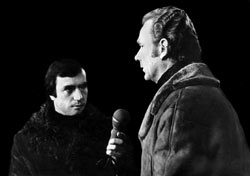 А было еще похуже. В светильнике, надо мной, лопнуло стекло. Раскаленный осколок упал мне за спину - хорошо еще, что не за воротник, а на мой стул, который тут же воспламенился. Счастье, что погас свет, - резко отбрасываю от себя стул и, когда включили другой светильник, делаю вид, что ничего не произошло, хотя новый стул мне не успели пододвинуть, и я вынужден был "сидеть" на полусогнутых ногах, покуда не запустили ленту. В студии угар, полно дыма от горелых тряпок, но уйти нельзя - программа рассчитана на 45 минут...