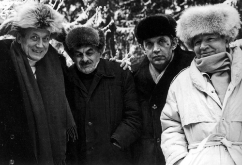 | «Пока ж не грянула пора Нам расставаться понемногу, Возьмемся за руки, друзья, Возьмемся за руки, друзья, Возьмемся за руки, ей-богу». Евгений Евтушенко, Булат Окуджава, Роберт Рождественский и Андрей Вознесенский, 1987 год |