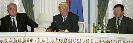 | Виктор Черномырдин, Борис Ельцин и Валентин Юмашев. В «Огонек» Юмашев пришел из «Комсомольской правды», где редактировал страницу «Алый парус» для старшеклассников. Позже стал ельцинским соавтором, а затем и членом семьи первого российского президента и руководителем его администрации |