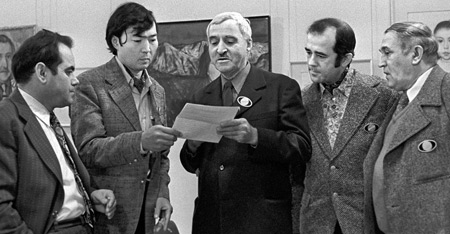 | Писатели и поэты Павел Боцу, Олжас Сулейменов, Константин Симонов, Виталий Коротич и Михаил Луконин во время работы Всемирного конгресса миролюбивых сил, Москва, 1973 год |