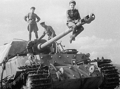 | Константин Симонов на первых захваченных в боях немецких тяжелых штурмовых орудиях «Фердинанд», 1943 год Фото «РИА Новости» |