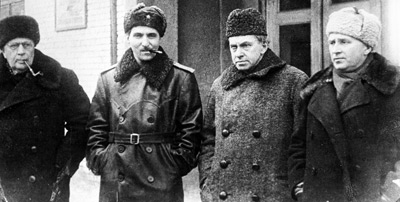 | Алексей Толстой, Константин Симонов, Илья Эренбург и начальник отдела Чрезвычайной государственной комиссии по установлению и расследованию злодеяний немецко-фашистских захватчиков Дмитрий Кудрявцев, 1943 год |