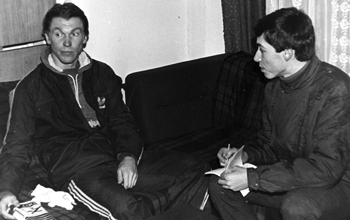 | Ноябрь 1985 года, Дмитрий Гордон берет интервью у Олега Блохина. «Вдруг Блохин подбегает ко мне: «Ну, пойдем поговорим» Фото Александра КУШКОВА |