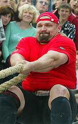 Соревнования отечественных силачей-финалистов на взлетно-посадочной полосе авиазавода «Авиант» выглядели очень зрелищно — дюжина огромных мужиков восемь часов кряду поднимала гигантские — до 360 килограммов — штанги, перебрасывала через перекладину 200-килограммовые каменные шары, поднималась по лестнице с грузом весом четверть тонны.