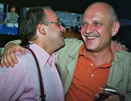 Харизматичный Микола Вересень, к сожалению, на "5-м" больше не работает, но выпить с бывшим коллегой Романом Чайкой, да еще по такому поводу, всегда готов