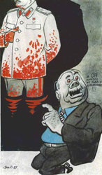 ![]() Сталин забрызган кровью. «Он ничего не знал о беззакониях!» — говорит обыватель на плакате. 1987 год |