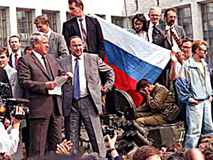 | Путч 19 августа 1991 года не остановил, а только усилил начавшиеся в стране необратимые процессы. «Страна ходила ходуном, Ельцин рвался в Кремль. С последним десятилетием ХХ века уходила целая эпоха». Знаменитое фото — Борис Ельцин и Александр Коржаков на танке перед Белым домом во время августовского путча |