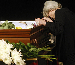 | Алиса Фрейндлих прощается с Анатолием Равиковичем. Артист был похоронен 11 апреля на Литераторских мостках Волковского кладбища в Санкт-Петербурге Фото «РИА Новости» |