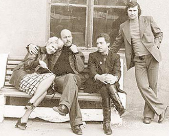 | Супруга актера Владимира Мальцева Светлана Еленская, Станислав Говорухин, Владимир Высоцкий и Леонид Бурлака на съемках «Места встречи», 1978 год |