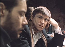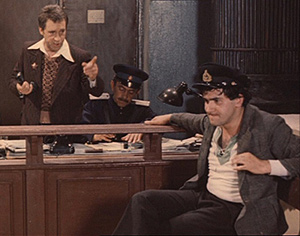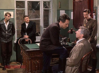 | Оперуполномоченные Тараскин (Андрей Градов), Пасюк (Александр Милютин), Шарапов и Жеглов на допросе Груздева (Сергей Юрский). «Ты мне не тычь, сукин ты сын!». — «Ну, ну, утихомирься!» |