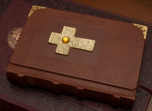 — ...с золотым обрезом, украшенную крестом с янтарем...