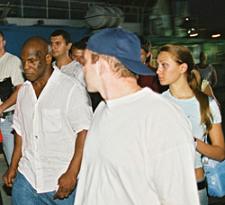 ![]() По Одессе Железный Майк прогуливался в окружении толпы фанатов и со спутницей. Видимо, девушка поразила Тайсона не только миловидной внешностью, но еще добротой и скромностью |