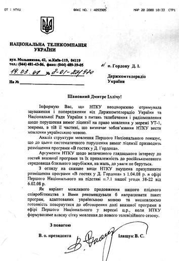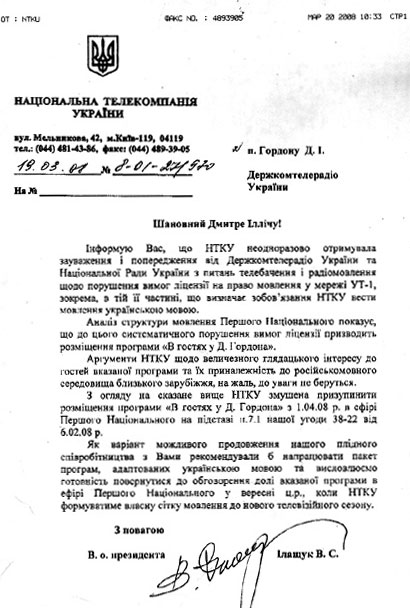 Новое руководство Первого национального в лице временно исполняющего обязанности президента телекомпании Василия Илащука письменно сообщило мне, что с 1 апреля моя авторская программа выходить не будет. Я, разумеется, знал, что к этому все идет, потому что на первой же планерке в ранге и.о. бывший диктор и ведущий эстрадных концертов Илащук сказал коллегам, что невзирая на высочайший рейтинг передачу Гордона нужно закрыть, и добавил еще пару фраз, которым наверняка позавидовали бы ведущие черносотенные газеты начала ХХ века и которые заставили присутствующих переглянуться: уж не ослышались ли они?