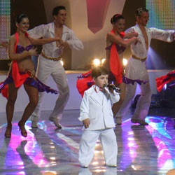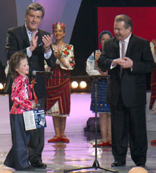 ![]() Президент Украины Виктор Ющенко и президент международного благотворительного фонда «Обдарованi дiти України» Михаил Поплавский поздравили шестилетнего артиста Арсения Журавеля с победой |