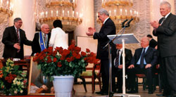 ![]() 6 марта 2006 года. 95 роз, привезенных в подарок юбиляру от днепропетровцев, у Владимира Ошко едва не реквизировали таможенники. Пришлось доставать из широких штанин пригласительный в Колонный зал. Юбиляр — второй слева. Крайний справа — Владимир Ошко, рядом с ним сидит Виктор Черномырдин |