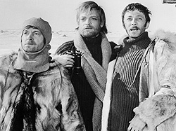 | Георгий Вицин, Владислав Дворжецкий и Олег Даль (офицер-авантюрист Евгений Крестовский) в картине «Земля Санникова», 1973 год. Поначалу на роль Крестовского планировался Владимир Высоцкий, который был весьма вдохновлен будущей работой и даже написал к фильму несколько песен |