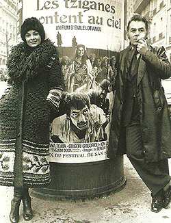| Светлана Тома в пальто, специально связанном для нее югославскими поклонниками, и Эмиль Лотяну в Париже возле афиши картины «Табор уходит в небо». «На премьеру во Францию невыездного Лотяну неожиданно отпустили» |
