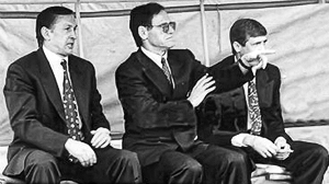 | Михаил Фоменко (слева), Йожеф Сабо и Владимир Бессонов на тренерской скамье. «Мы же, особенно тренеры, всегда по результату своей работы, а не по красноречию оценивались», 1992 год |