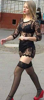 Скандальное платье пошила местная портниха, в точности скопировав фасон одной из новинок Dolce&Gabbana (в нем, кстати, успела выйти в свет эпатажная певица Леди Гага). На фото в глянцевом журнале наряд смотрится вполне пристойно, но Настя дополнила его черными чулками в мелкую сетку и красными туфельками на высокой танкетке. Получилась униформа жриц любви, да и то не высокооплачиваемых.
