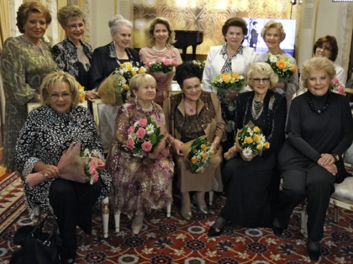 | 80-летие Людмилы Зыкиной в Кремле. В первом ряду: Галина Волчек, Александра Пахмутова, именинница, Светлана Дружинина, Елена Образцова. Во втором ряду: Валентина Матвиенко, Светлана Моргунова, Элина Быстрицкая, Светлана Медведева, Валентина Терешкова, Юлия Борисова и Ирина Роднина, 10 июня 2009 года |
